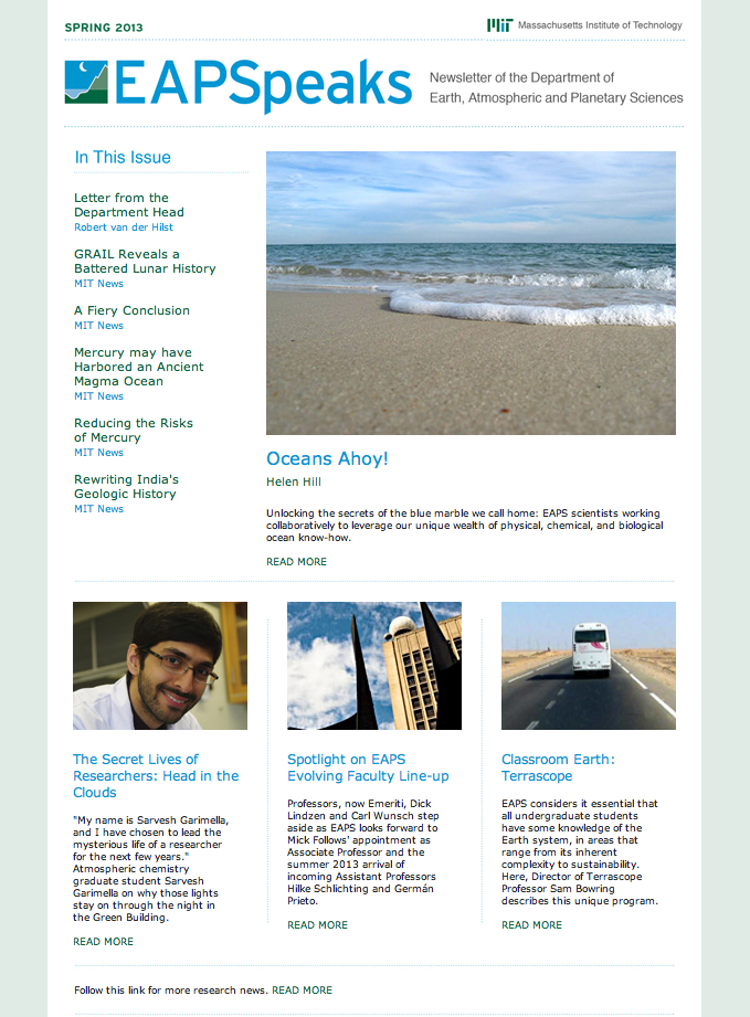 Read all about oceanography in EAPS, meet atmospheric chemistry graduate student Sarvesh Garimella, review member news and more in the Spring issue of EAPSpeaks.