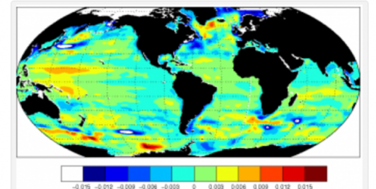 Figure 1: Estimated trends, in meters/year, of sea level (with the global mean of about 0.002m/y removed), and showing how complex sea level change is. In places, regional estimates can be more than five times bigger than the global average. The estimate was made by combining the MIT ocean general circulation model (MITgcm) with more than 1 billion oceanic observations of all kinds over the period 1992 to 2007.